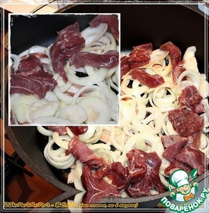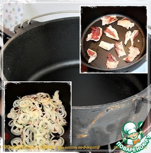 Потом выкладываем в казан, по кругу, ближе к стенкам кусочки мяса с лопатки.