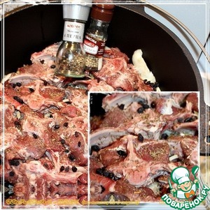 А в центр, плотно, укладываем кусочки седла барашка. И припорошим перцем молотым, зирой, и немного семени укропного добавим. Солим. Без фанатизма только. Лучше пусть недосоленным будет, чем …