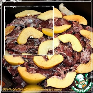 Вот тут я немного отошел от классики. Взял несколько кусков айвы, разрезал их потоньше и поверх мяса положил. Рекомендую повторить мой опыт. Не пожалеете.