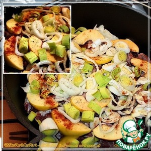А сверху опять лучок, вперемешку с пореем и зиры мал – мало. И немного паприки сладкой. Сухой и молотой.