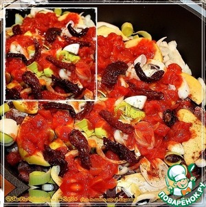Потом помидоры. Как я сказал уже, я использовал консервы и вяленые помидоры. Если будете свежие класть, то режьте помидоры впоперек, прямо над казаном. И раскладывайте их так, чтобы образовался помидорный ковер.