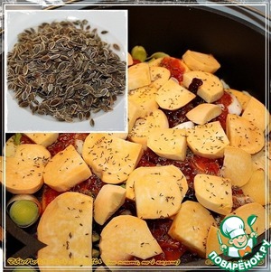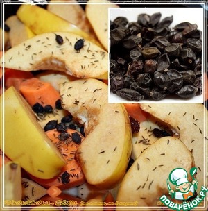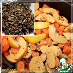 Потом выкладываем морковку и айву. И припорашиваем поверх зирой. Не бойтесь переборщить. Зиры много не будет. Хотя…, если кому чрезмерный аромат не нравится, то … в общем тут включайте саморегулирование.