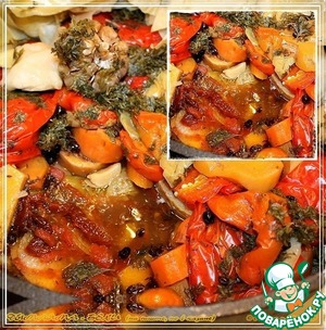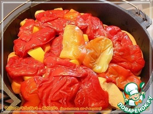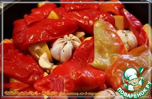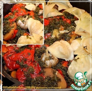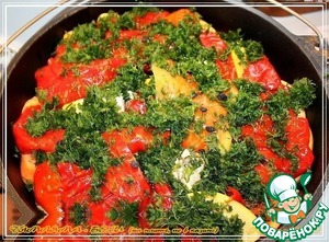 Кстати, зелень можно и не резать, а напротив, связать в один пучок и так и положить поверх перца.
