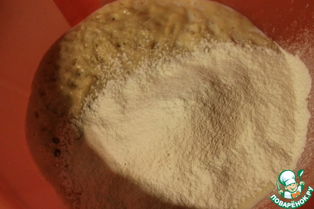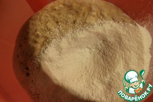 Перелить опару в глубокую миску, добавить оставшееся молоко и соль, перемешать. Постепенно добавить просеянную муку. Замесить тесто.