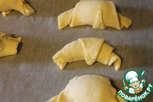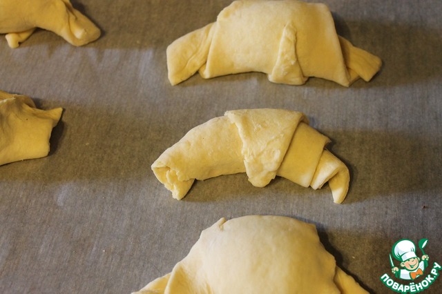 Круассаны кладем на противень застеленный пергаментом. Выпекать при температуре 200 градусов 10-20 минут. Подавать в теплом или холодном виде! Приятного аппетита!