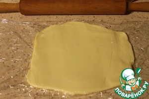 Защипать края теста слева и права. Развернуть тесто узкой стороной к себе и аккуратно надавливая пройтись скалкой по всей длине теста. Следите, чтобы масло не вышло из защипленных концов.