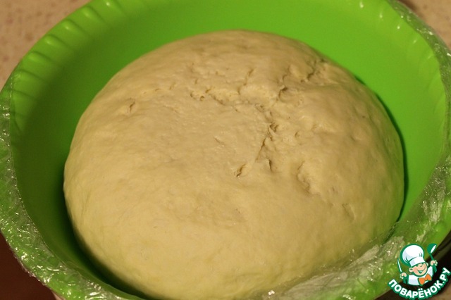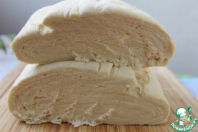 Вот какая красота получается!)) Отрезаем половину теста, одну часть раскатываем на припыленном мукой столе толщиной 4-5 мм. Остальное тесто убираем в морозилку.