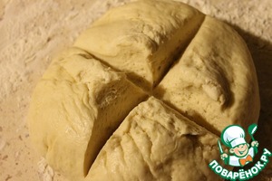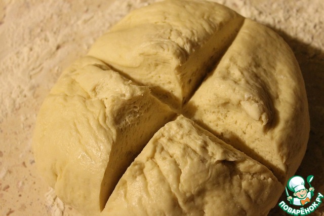 Выложить его на рабочую поверхность, слегка припыленную мукой и сделать крестообразный разрез на 2 см в глубину.