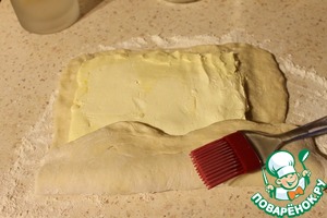 Затем растянуть концы теста в разные стороны, формируя квадрат. Слегка раскатать скалкой и выложить сверху пласт масла.