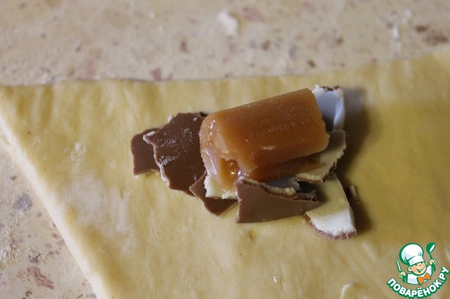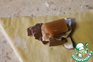 Нарезаем пласт теста на треугольники. На широкий край кладем киндер-шоколад, поломанный на кусочки и ириску сверху. Сворачиваем рогаликом.