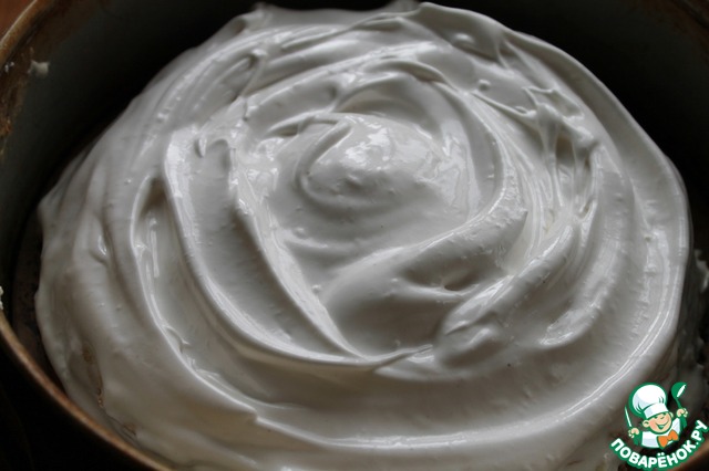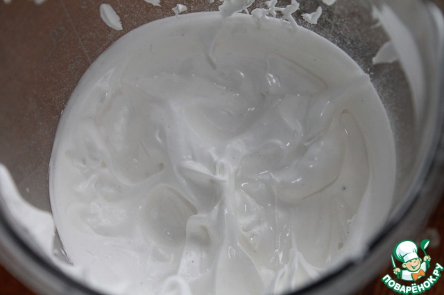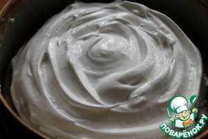 Охлажденные яичные белки взбить с сахарной пудрой и крахмалом до крепких пиков.