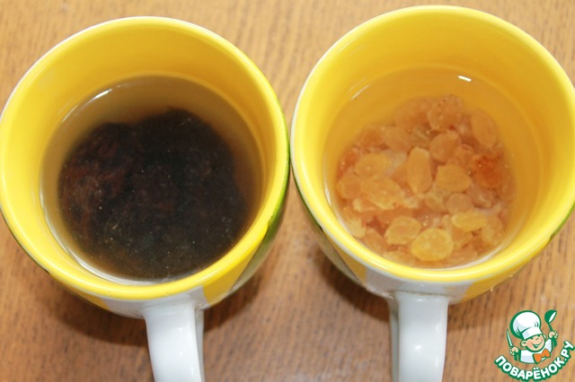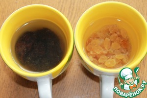 Чернослив и изюм залить горячей водой и дать постоять минут 15. Высушить, чернослив нарезать.