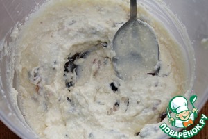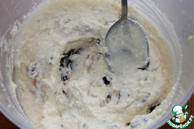 В миске смешать творог и сгущенку, добавить чернослив и изюм, хорошо перемешать.