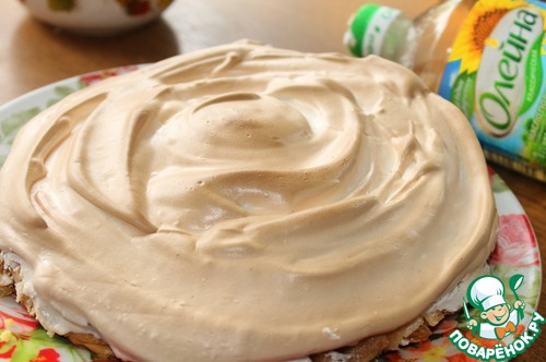 В форму (должна быть большего размера, чем блин) или противень смазать сливочным маслом выложить блин смазать начинкой и так пока не кончатся блины или начинка (у меня закончилась начинка, нельзя было без присмотра оставлять))) поэтому получился низенький). Выложить сверху белок, так же обмазать края. Выпекается пирог в духовке, разогретой до 180 гр., пока подрумянится белок, минут 20, у меня духовка не очень, поэтому у меня пирог стоял дольше, и я дорумянивала его под грилем).