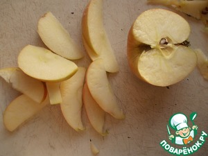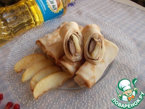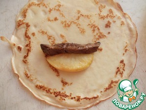 На каждый блинчик выкладываем по кусочку печени и по кусочку яблока.