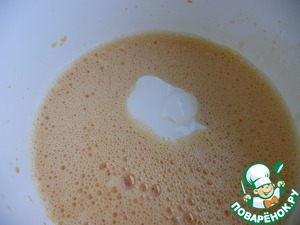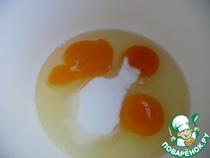 Яйца, соль, сахар, ванильный сахар взбить венчиком или миксером.