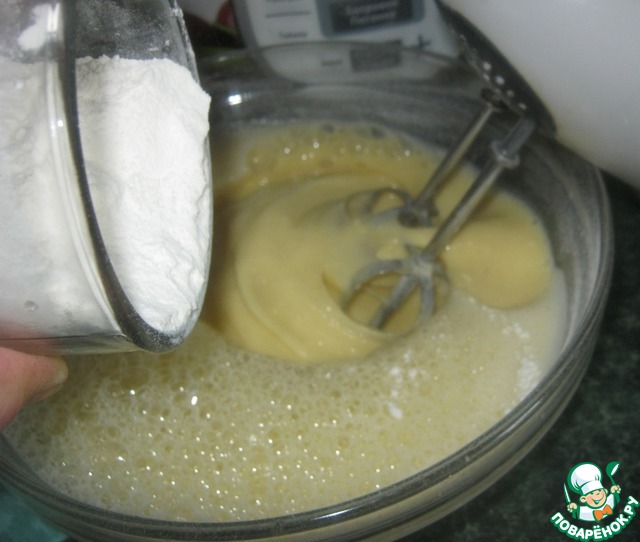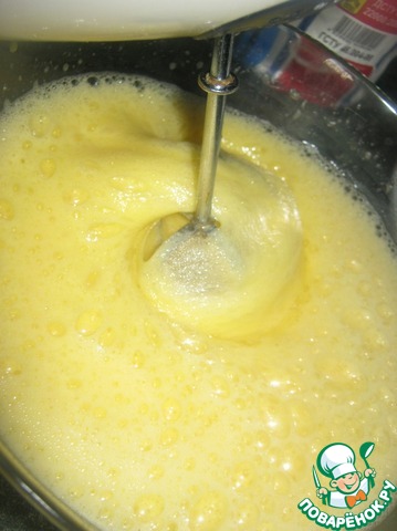 К яичной массе добавляем половину молока и сахар, продлолжая взбивать