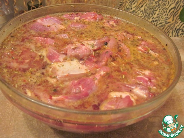 Для начинки режем мясо (у меня грудинка)и замачиваем в воде и всех специях и соевом соусе минимум на час