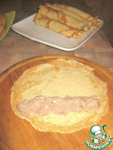 Выкладываем начинку на блины и сворачиваем трубочками.