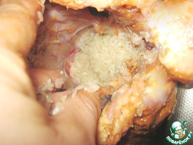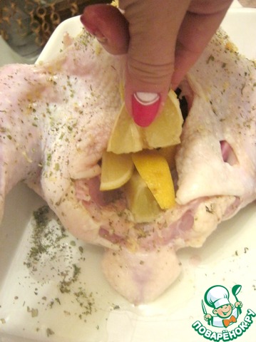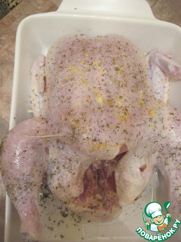 Поставить курицу в духовку и запекать до готовности и золотистой корочки, около 1,5 часа.