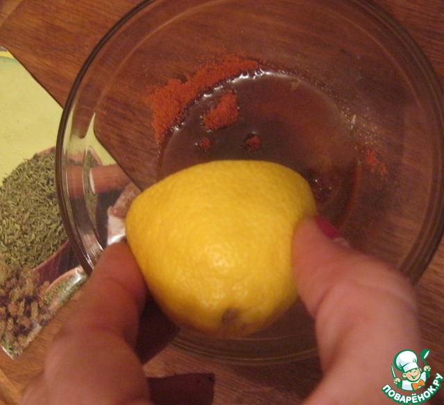 Добавить 3/4 стакана вин и специи, сок из одного лимона, присолить по вкусу.