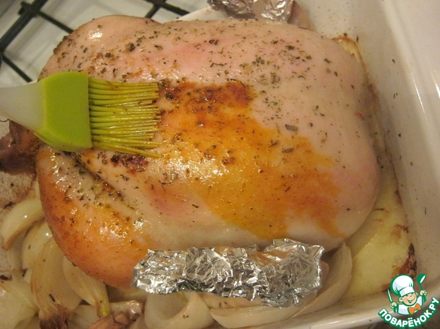 Лук убрать из противня по истечение 1 часа, а курицу продолжить готовить.
