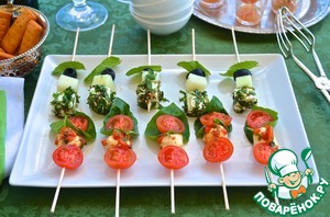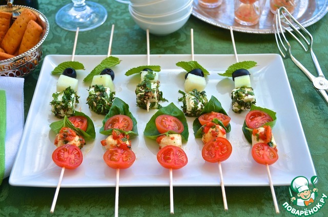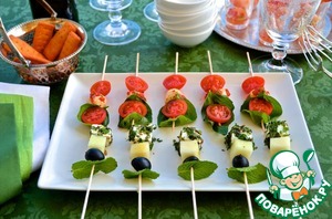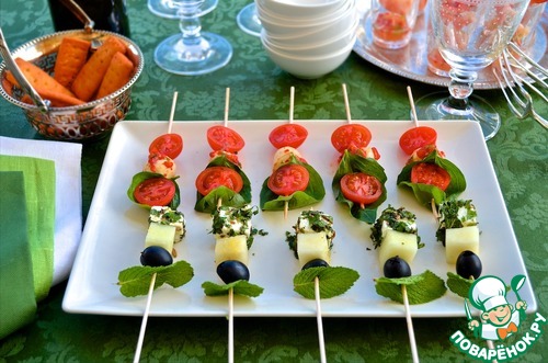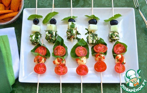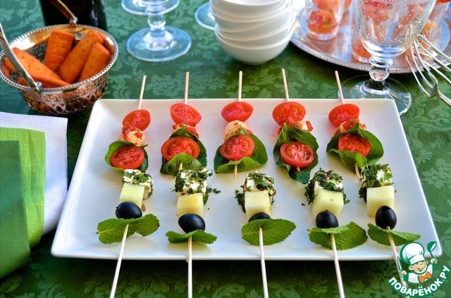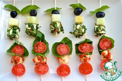 Эти лёгкие закуски из маринованного сыра, овощей, фруктов и зелени очень красиво смотрятся на праздничном столе. Они подаются на шпажках, поэтому отлично подходят для большого количества гостей, когда тарелок на всех не хватает. Готовятся они очень просто, но нанизывание на шпажки потребует некоторого времени.