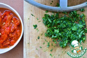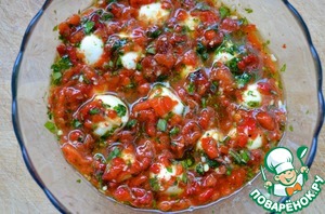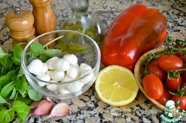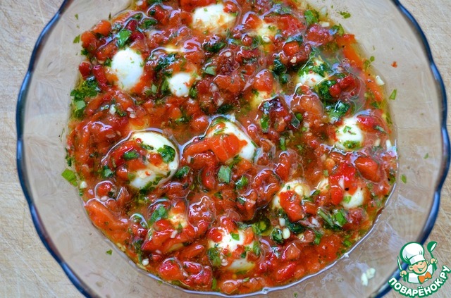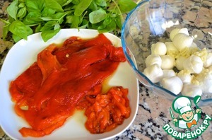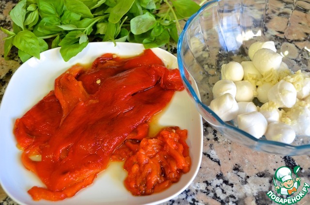 1. Перец запечь, очистить от кожицы и мелко порубить. Чеснок мелко порезать и добавить к боккончини.