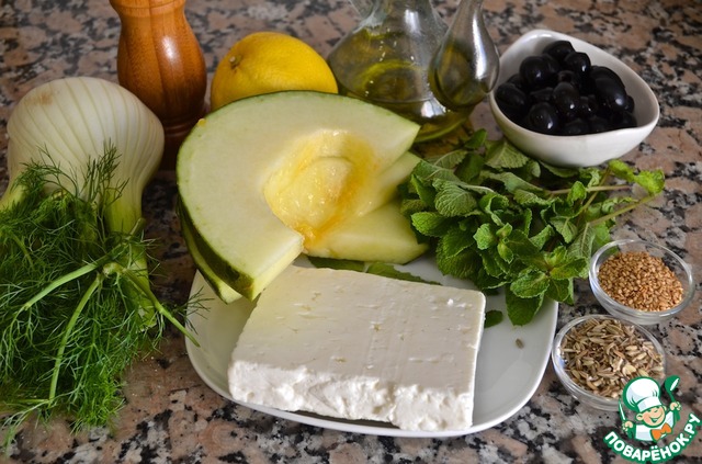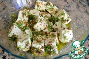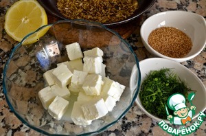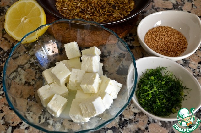 5. Фету порезать на 20 кубиков средней величины. Зелень фенхеля порубить. Семена фенхеля и кунжута обжарить на сухой сковороде 30 секунд до появления аромата.