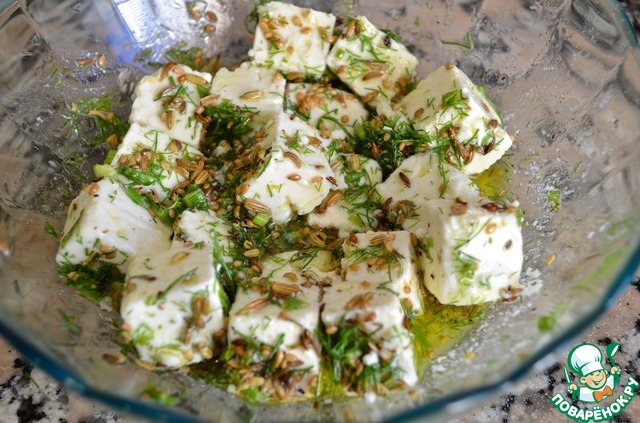 6. В мисочку с фетой добавить лимонный сок, лимонную цедру, семена, зелень, черный перец и оливковое масло. Размешать и убрать в холодильник мариноваться на ночь. Перед подачей посыпать фету рубленной мятой.