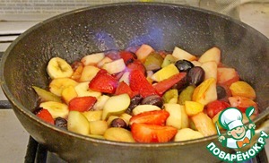 В сковороде растопить сливочное масло, выложить фрукты, присыпать сахаром и потряхивая сковороду готовить минут 5.