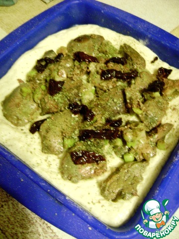 Достать тесто из холодильника, дать согреться. Разделить на две половины. Одну разложить по форме, растянуть равномерно. Разложить печень с луком, присолить, поперчить и посыпать майораном. Разложить сверху порезанные вяленые помидорки.