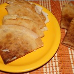 6) Выпекаем тоненькие блинчики (хорошо распределяем по сковородке), не бойтесь, если появятся пузырики (большие можно проткнуть). Каждый блин смазываем сливочным маслом. Можно есть в сладком виде, можно, как обычные, с разными начинками, сметанкой и т.. д..