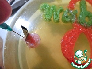 Для букв и цифр используем только иглу шприца, делаем уколы в желе плотно друг к другу. Не забудьте, что мы работаем иглой по изнанке, следовательно, надпись должна быть в зеркальном отражении. Я сделала шаблон из плотной бумаги, приложила его к желе и быстро отметила контур иглой, потом заполнила по всей площади.