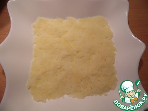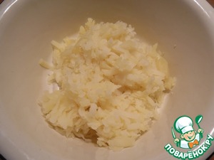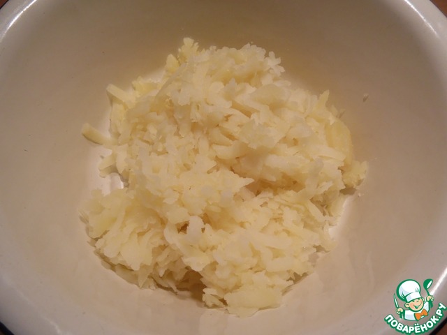 Картофель отварить "в мундире", остудить, очистить, натереть на крупной терке, разделить на 2 части.