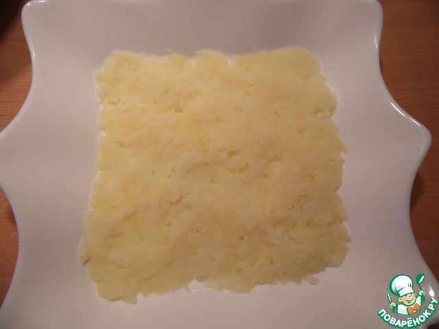 Первую часть картофеля выложить первым слоем в салатник. Каждый слой промазать майонезом.