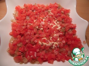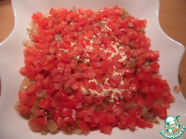 Помидоры нарезать четвертинками, удалить из них семена, мякоть обсушить, мелко нарезать, выложить четвертым слоем.