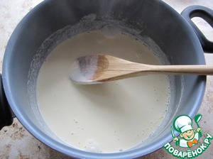 Сливки соединить с желтком, сахаром по вкусу, прогреть на маленьком огне до загустения смеси при постоянном помешивание.