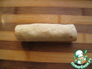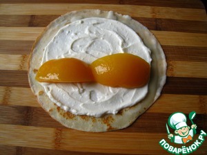 Творожной массой смазать весь блин. Консервированный персик разрезать на дольки, уложить с одного края блинчика и свернуть в трубочку.
