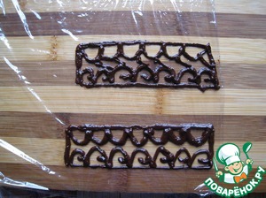 Растопить шоколад с сывороткой на водяной бане, когда станет теплым залейте его в пакет и отрежьте маленький уголок. На разделочную доску постелить пленку и нарисовать узоры. Предварительно отмерить диаметр блинов.