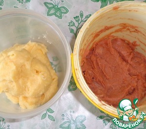 Тесто разделить на две части. В одну часть добавить какао и перемешать.