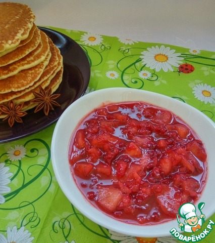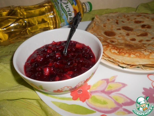 Кисло-сладкий соус с брусникой и яблоками отлично сочетается с домшними тонкими блинчиками.