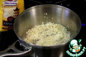 Рис ТМ "Мистраль" длиннозерный Ориент промываем в проточной воде и добавляем к луку. Перемешиваем, что бы каждая рисинка покрылась маслом. Готовим примерно 2-3 минуты помешивая.