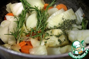 Курицу готовим отдельно. Лук, морковь, луковицу фенхеля крупно режем, кладем в казан, добавляем веточки розмарина и тимьяна и тушим в казане на растительном масло около 15 минут.