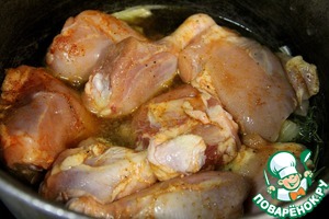 Укладываем куски курицы сверху овощей, наливаем стакан белого вина, полстакана белого винного уксуса и 1 стакан горячей воды (кипяток), закрываем крышку и тушим на небольшом огне 1.5 часа.