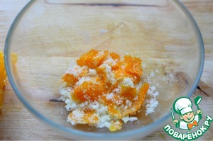 В емкость с сахаром выжать апельсиновый сок из того, что осталось после филирования и поставить в холодильник. -