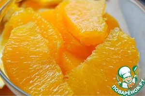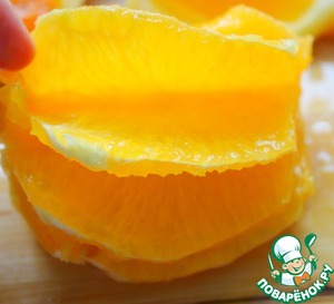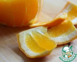 Срезать у апельсина верхушку, низ и снять с боков ножом кожуру до мякоти - филеруем апельсин