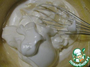 Отдельно взбиваем белки с сахаром до образования белой пены. Очень осторожно вводим их в наше тесто медленными движениями при помощи венчика или ложки. Наливаем растопленное сливочное масло в смесь. Слегка перемешиваем.