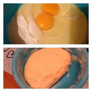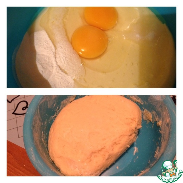 Всыпать разрыхлитель и муку. Вымесить эластичное тесто. -