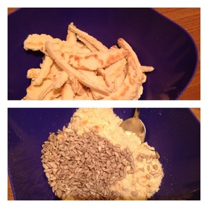 Обрезки сложить в чашку и руками растереть в крошку, или воспользоваться блендером. Добавить к крошке семечки подсолнуха и перемешать.